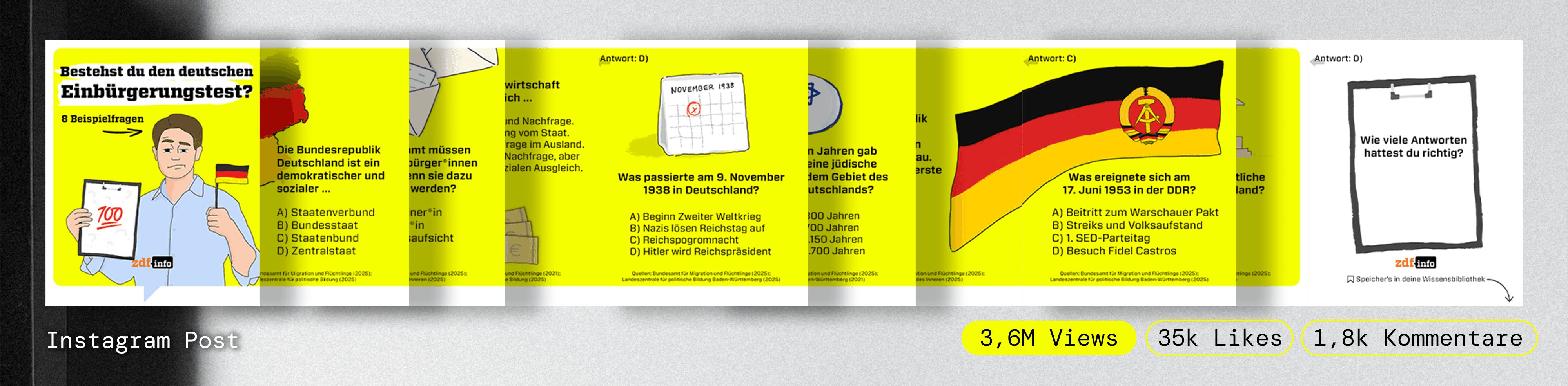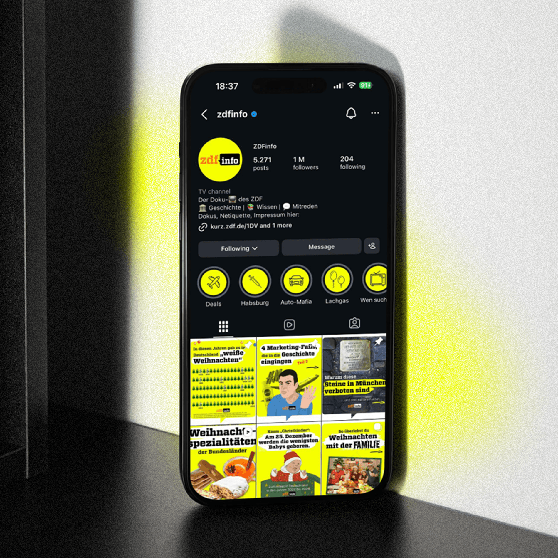 Im Gestaltungsteam für die ZDFinfo Social-Media-Kanäle arbeite ich eng mit der Redaktion zusammen, um Inhalte visuell zu konzipieren und umzusetzen. ZDFinfo ist mit über 1 Million Follower:innen auf Instagram ein besonders erfolgreiches Projekt, das vor allem die jüngere Zielgruppe anspricht.